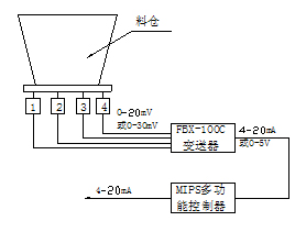 MIPS儀表將來(lái)自FBX-100C毫伏變送器的標(biāo)準(zhǔn)電流信號(hào)進(jìn)行I/V變換,A/D轉(zhuǎn)換轉(zhuǎn)成數(shù)字量,而后去皮重,按預(yù)置的數(shù)學(xué)模型和有關(guān)參數(shù)計(jì)算出料倉(cāng)中物料的重量。一方面在面板上顯示出來(lái),另一方面以標(biāo)準(zhǔn)的4~20mA電流信號(hào)將此料倉(cāng)的噸位傳給DCS(或其它種類的上位機(jī))。